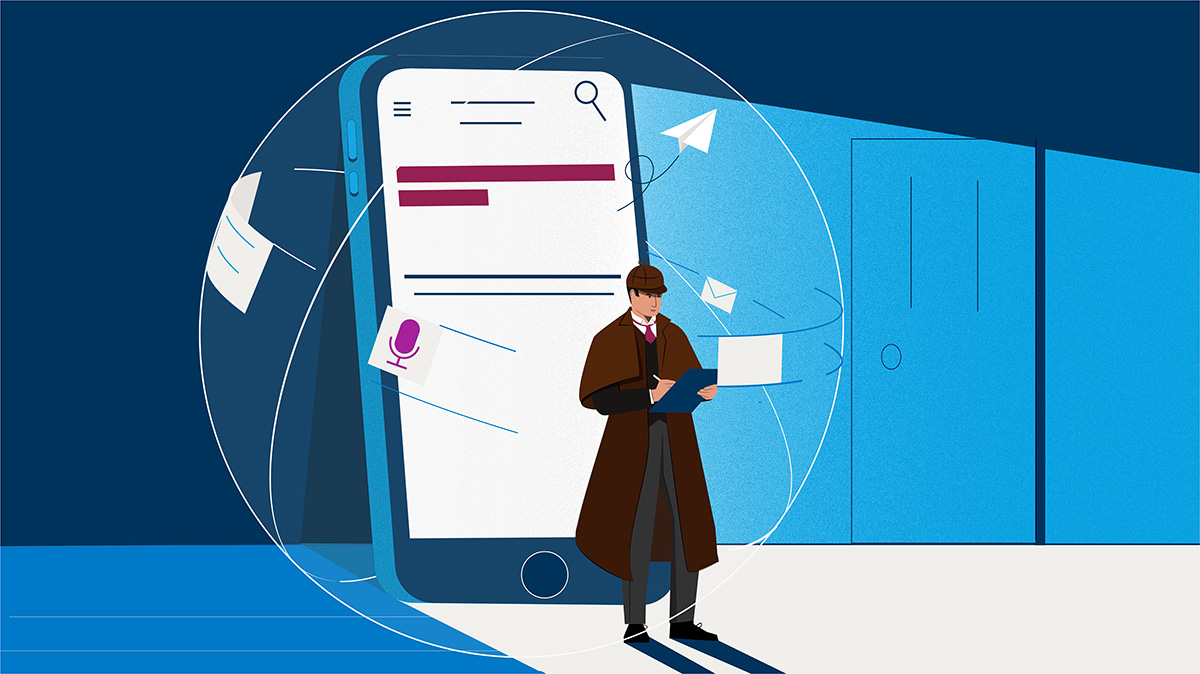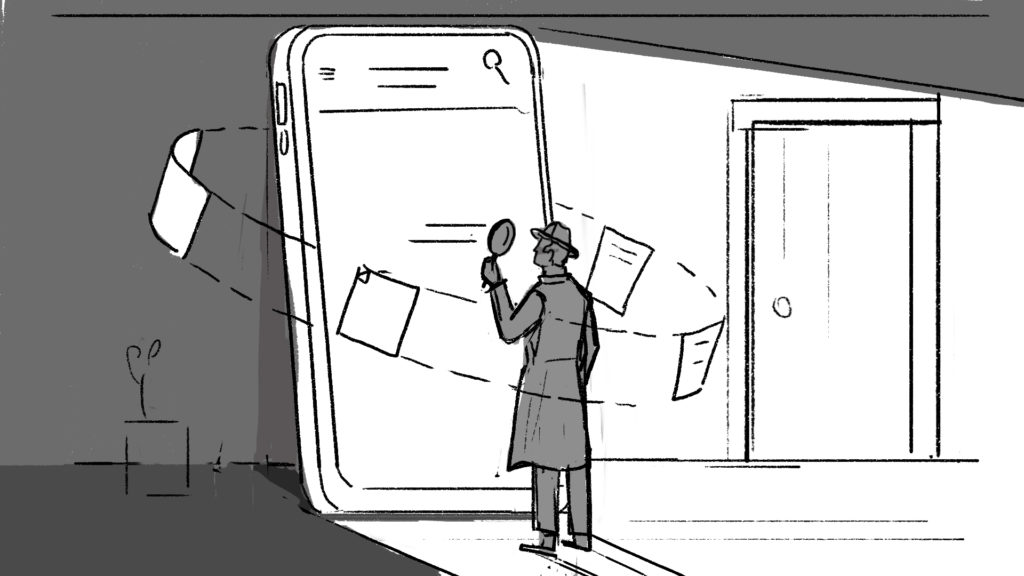 For this concept I had the idea of using a detective character inspecting information on an oversized smart phone. I wanted to get across the idea of people being inundated with information on the internet and chose to show information whizzing around him. This was enhanced by the scale of the smart phone compared to the character.